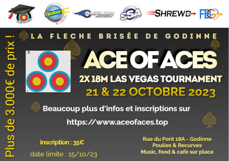 En tant que président de la Flèche Brisée de Godinne, c’est avec une grande joie que je vous présente le Ace of Aces 2023. Une nouvelle édition complètement revue en nous basant sur tous les retours de la 1ère édition 2022. Cette fois, il y a plus de places pour tout le monde, y compris pour tirer et il y aura de vraies finales palpitantes avec des duels (dimanche aprèsmidi).