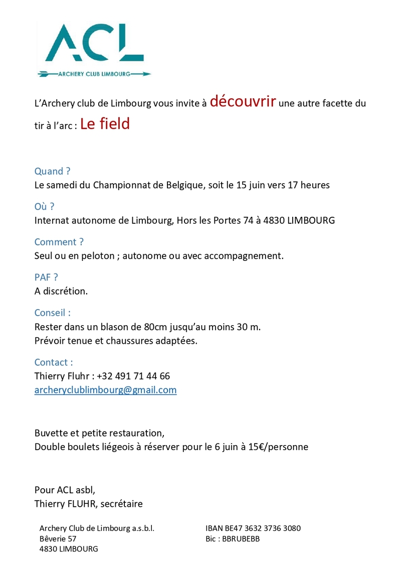 Comme vous le savez peut-àªtre déjà , notre club ACL a le plaisir d’organiser le Championnat de Belgique de Field en partenariat avec MSB, club de Hasselt les 15 et 16 juin 2024 (vers l’invitation).